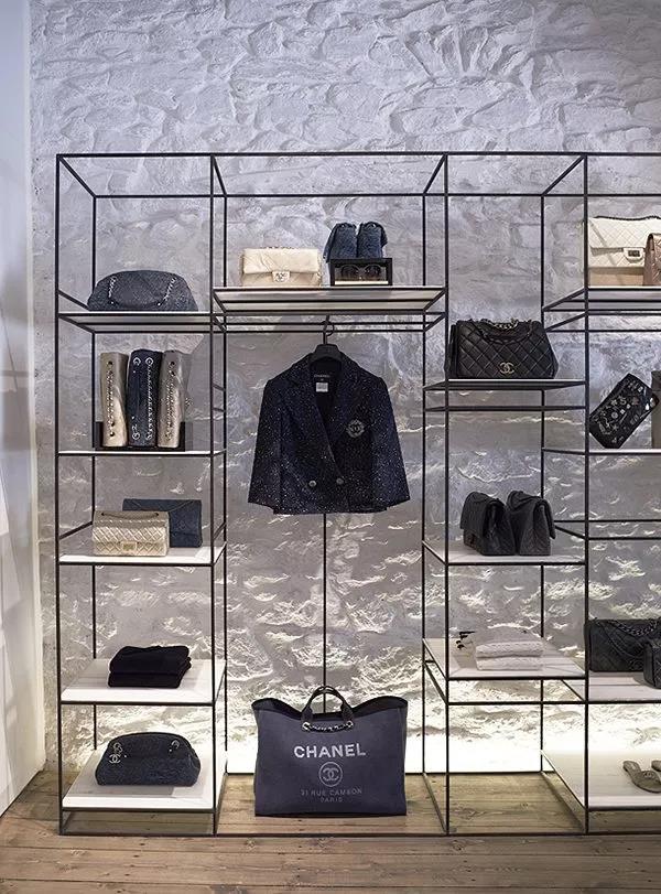 奢侈品类是一个特殊的群体,墙面陈列的主要不同之处便在于其容量,由于很多品牌将其产品品类分区明确,因此其墙面陈列更多的是协调主题,款式与色彩。甚至很多时候服饰部分已经省略了墙面陈列的某一个区域只做一根挂通,简洁 高级 是奢侈品首要原则!超低密度的陈列辅以一些装饰设计类道具点缀可以提升店铺整体美观。