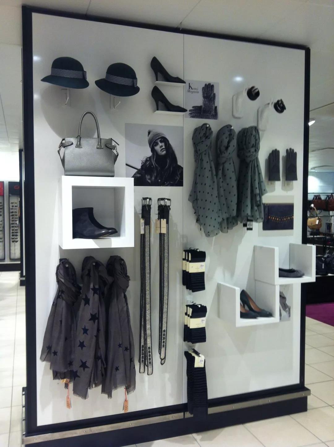 配饰类因为种类繁多,且形状设计完全不同,因此陈列师可以选择略微“放飞自我”,根据颜色,款式搭配,布局可略显随意,增强陈列的活泼感,不让消费者感觉严肃。