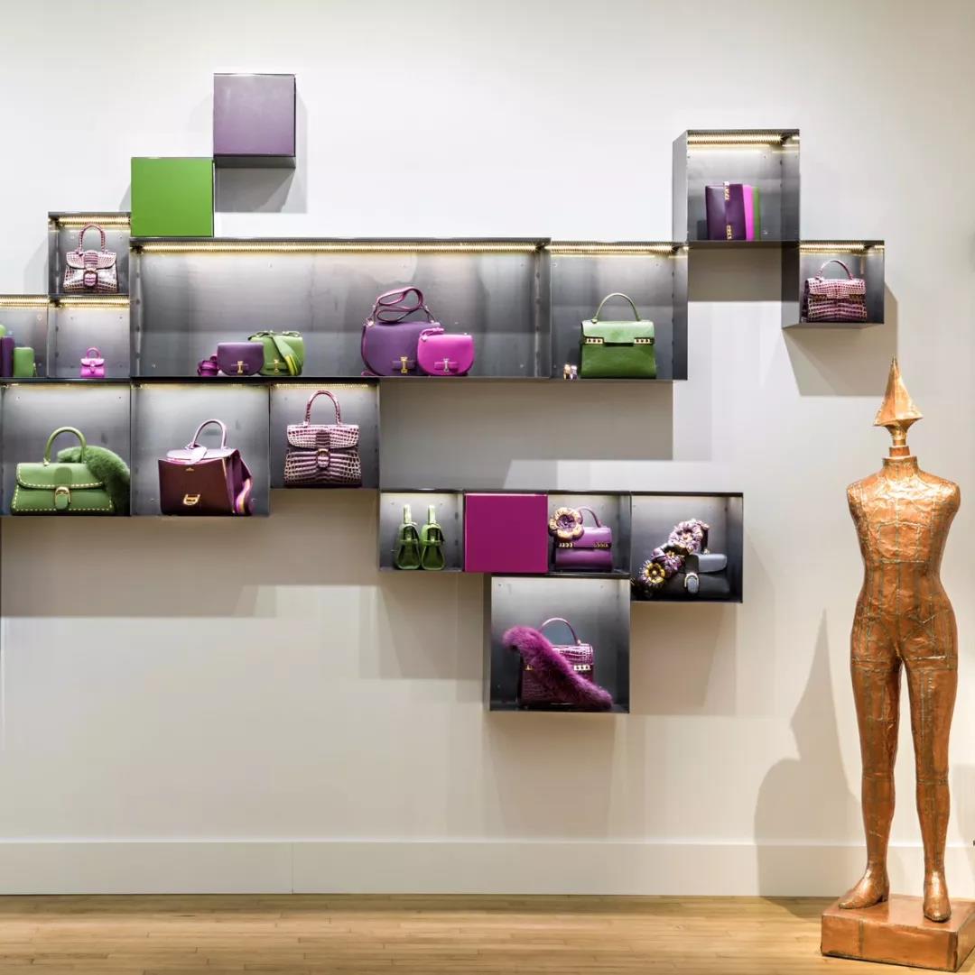 由于鞋包在这里不再作为配饰,因此,一些趣味创意技法的陈列方式不再仅仅展示在墙面最高层,而是在中间区域,突出品牌的新品,故事性以及商品之间的搭配及关联性。