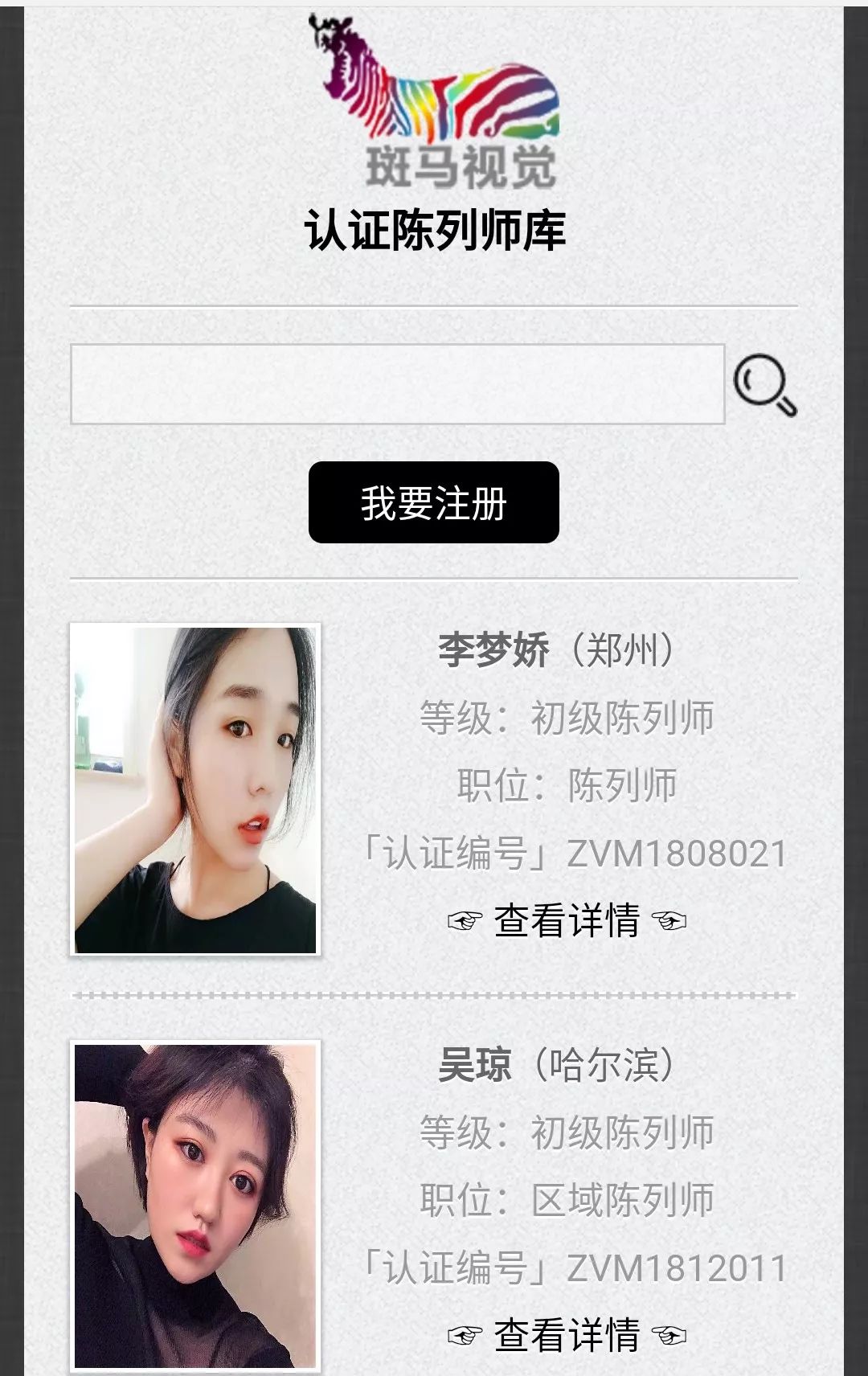 进入“斑马视觉VMD”公众微信就可以进入“认证陈列师库”查询。