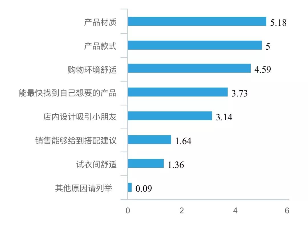 除了消费者要求的购物环境舒适以外,与其他时尚服饰购物不同,童装消费者将“能够最快找到自己想要的产品”列位十分靠前,以及不需要销售给到搭配建议。这也侧面说明了我们刚才的分析,很多童装消费者是完成任务一般在购物,想在舒适的环境下尽快解决购买刚需。