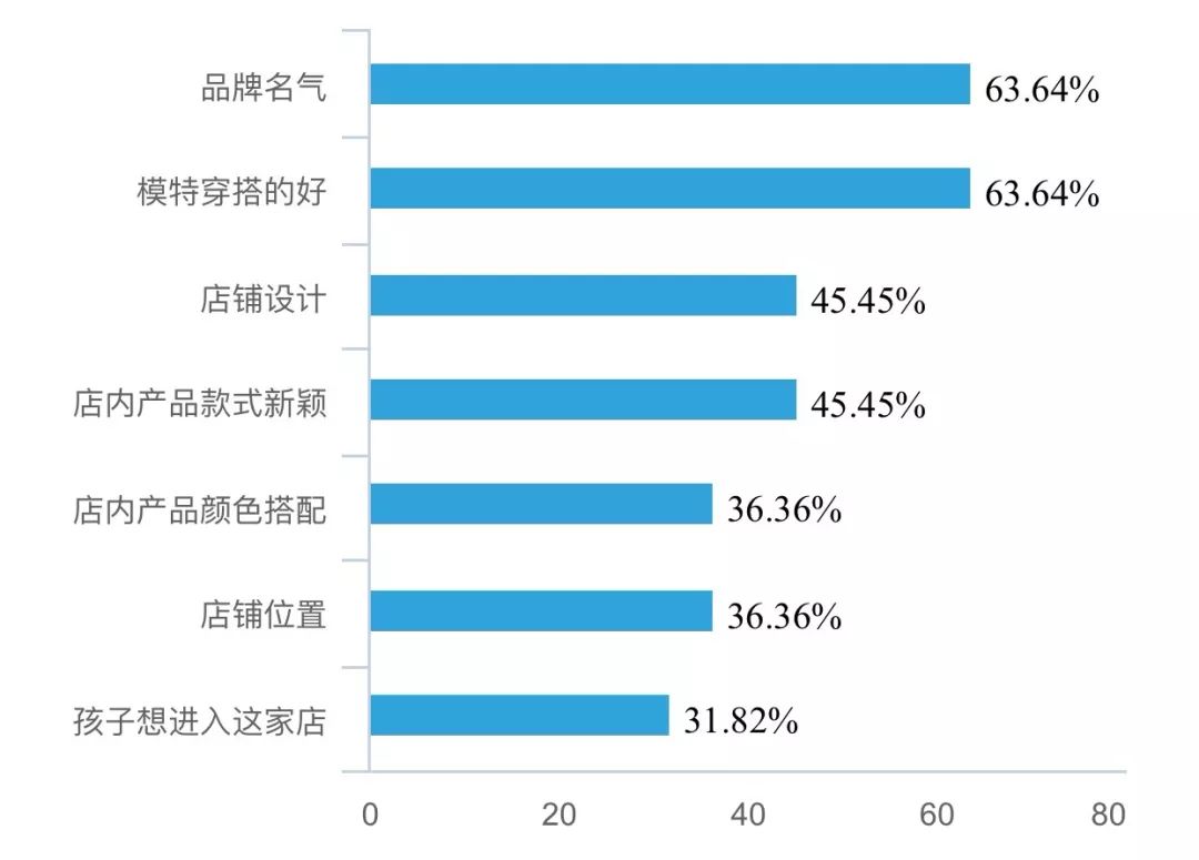 7. 关于逛街时什么因素会吸引消费者进入一家童装店这个问题十分有趣!我们惊讶的看到,橱窗中或店中"模特穿搭的好"这个选项居然和"品牌名气"并列第一位!因为消费者还未进入店铺,这就意味着品牌的视觉陈列相当的重要!店铺设计及产品款式新颖也起到了较大影响。