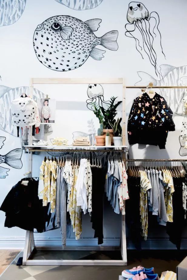 童装店铺墙面还有另一番用途,那就是提升氛围,很多品牌选择装点墙面来增强童趣氛围,似乎进入了童话世界。。。