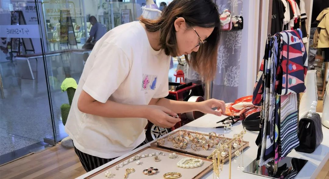 孜蕊在做陈列实操